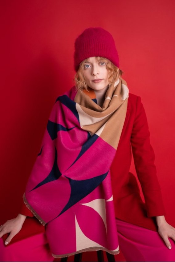 Wyrazisty szal damski jesienno-zimowy, który ożywi każdą stylizację. Model w intensywnych kolorach z geometrycznymi wzorami, wykonany z miękkiego, przyjemnego dla skóry materiału. Doskonały na co dzień do miejskich zestawów – jesienią lekko zarzucony na szyję, zimą otulający ciepłem.
