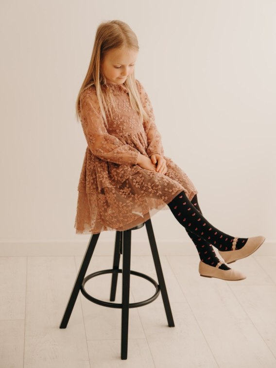 Przedstawiamy czarujące rajstopy dziecięce, które łączą wdzięk z czułym designem. Te rajstopy ozdobione są urzekającym wzorem małych różowych serduszek na tle głębokiej czerni, co przywołuje skojarzenia z ciepłem, miłością i otuleniem.