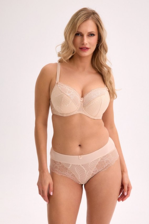 Biustonosz typu semi soft o konstrukcji SS10, łączący elegancję i wygodę. Miseczki z delikatnej koronki podszyto cienką pianką i od wewnątrz wykończono bawełną, co zapewnia komfort noszenia. Boczki wykonane z gładkiego, sprężystego materiału, wzmocnione pionową fiszbiną, stabilnie podtrzymują biust. Ramiączka są regulowane i nieodpinane.