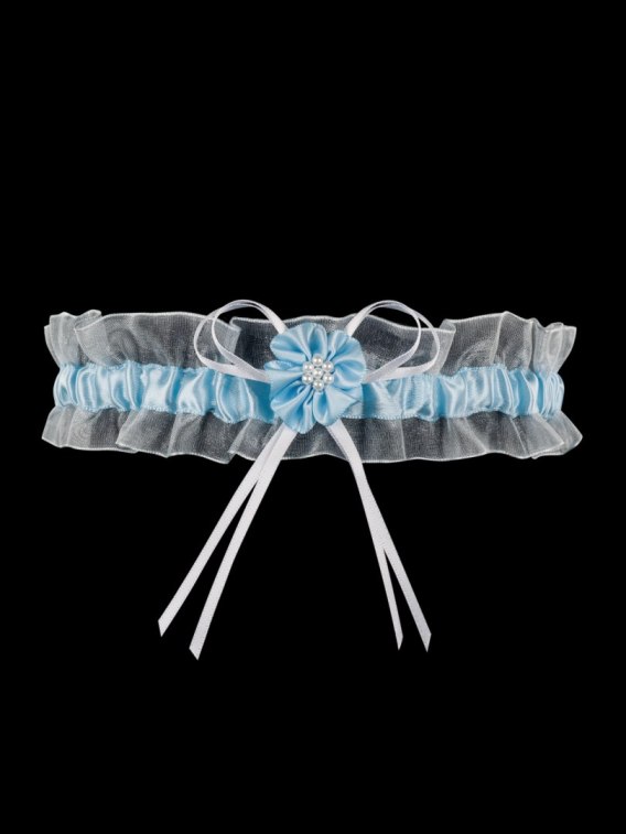 Błękitno-biała, typowo ślubna podwiązka z satynowej taśmy, wykończonej na górze i na dole delikatnym tiulem, ozdobiona białą kokardką oraz błękitnym kwiatkiem z drobnymi perełkami w środku. Model...