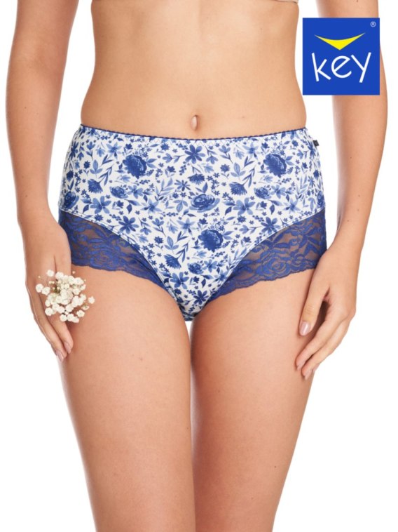 Figi damskie o wyższym kroju, wykonane z wysokiej jakości wzorzystej bawełny, dolna część zakończona koronką. Opakowanie zawiera dwie sztuki prezentowanego modelu.