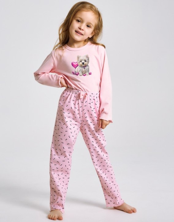 Piżama dziewczęca z wysokiej jakości bawełny. Koszulka z długim rękawem, przód ozdobiony kolorowym nadrukiem. Długie spodnie, w pasie wygodna gumka z ozdobną kokardką. Skład: 100% bawełna