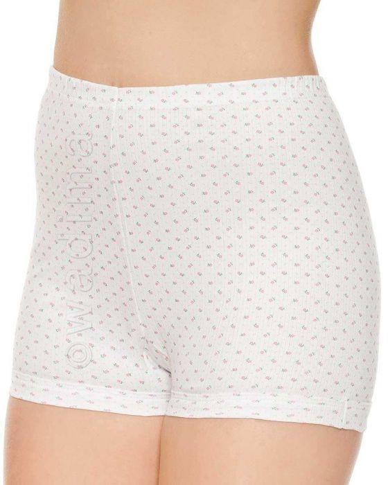 Figi damskie wykonane z ciepłej, dwuwarstwowej dzianiny INTERLOCK z czystej bawełny. Materiał o delikatnej prążkowanej fakturze zapewnia komfort noszenia, a dłuższe nogawki zakończone lamówką chronią przed chłodem. Klasyczny biały kolor z subtelnym nadrukiem. W pasie wszyta elastyczna guma. Wygodne, trwałe i praktyczne. Pakowane po trzy sztuki – każda para z innym nadrukiem.